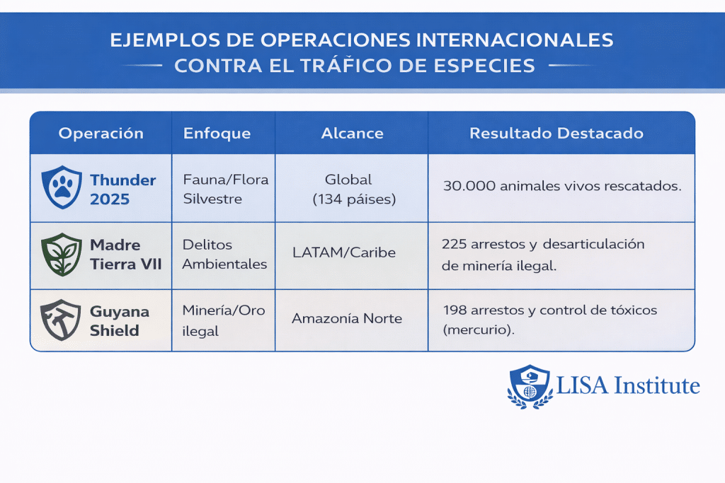 Las operaciones recientes de cooperación internacional, lideradas por iniciativas como el Proyecto GAIA (2024-2027), han transformado la respuesta regional ante los delitos ambientales. En este marco, la «Operación Madre Tierra VII» (desarrollada en países como Colombia, Costa Rica, México y República Dominicana), marcó un hito operativo al coordinar acciones simultáneas que resultaron en 225 detenciones y la identificación de más de 400 sospechosos vinculados a redes de tráfico de fauna, madera y minería ilegal.