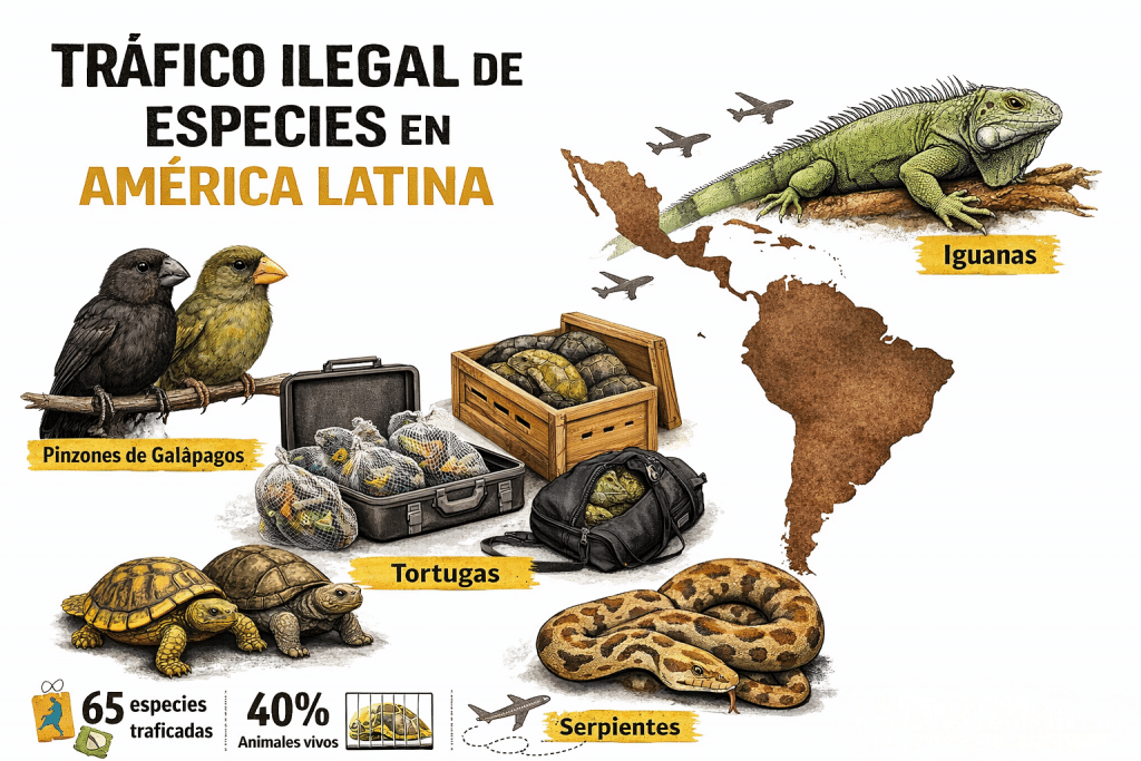 Entre las más frecuentes se encuentran pinzones, que representaron el 33% de las incautaciones de aves registradas en el transporte aéreo, así como lagartos, serpientes y tortugas, capturados principalmente para el comercio de mascotas. El informe también señala que casi 40% de las incautaciones conocidas en el sector aéreo correspondieron a animales vivos, lo que incrementa la presión directa sobre poblaciones silvestres y los riesgos sanitarios asociados.