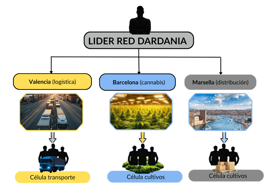 Red Dardania es una organización de origen albanés, dedicada al narcotráfico internacional, con fuerte presencia logística y distribución en Europa occidental. Su estructura se basa en un modelo modular por nodos, cada uno con funciones estratégicas, operativas y tácticas: Valencia para almacenamiento y transporte de cocaína, Barcelona para coordinación con Grupo Shkodra y Marsella para distribución en Francia.
