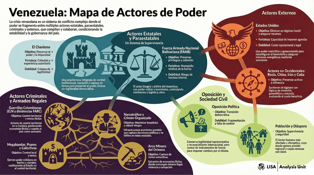 La caída de Nicolás Maduro no implica automáticamente el colapso del sistema de poder construido por el chavismo durante más de dos décadas. Venezuela entra en una fase crítica donde actores estatales, armados, criminales y externos compiten por redefinir el equilibrio político, económico y de seguridad. Desde la Fuerza Armada y las redes criminales hasta Estados Unidos y potencias extrahemisféricas, el desenlace dependerá de la interacción entre coerción, rentas y legitimidad. Analizar estos actores es clave para comprender los riesgos y oportunidades de una transición en uno de los entornos más complejos de América Latina.
