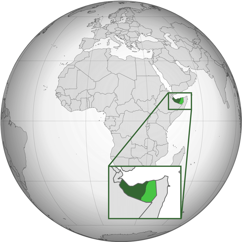 Somalilandia se encuentra en el extremo noroeste de África, a lo largo de la costa del mar Rojo. Limita al oeste con Yibuti, al norte con el Golfo de Adén, al sur con Etiopía y al este con Somalia, con una costa marítima en el océano Índico. Su ubicación la coloca en una zona estratégica para el comercio y la navegación. En términos de referencia geográfica, Somalilandia ocupa principalmente la región de Somaliland y comparte frontera terrestre con Etiopía al sur, mientras que al oeste mira hacia el Océano Índico y el estrecho de Bab el Mandeb en la distancia.